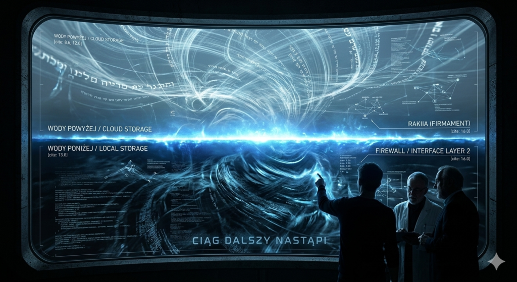RAKIIA (FIREWALL): Nad oceanem widać colossalny, łukowy ekran ochronny oznaczony jako RAKIIA (NIEBO) / FIREWALL, izolujący system od surowego kodu "Wód Powyżej" (rzadkich, złotych strumieni danych).
