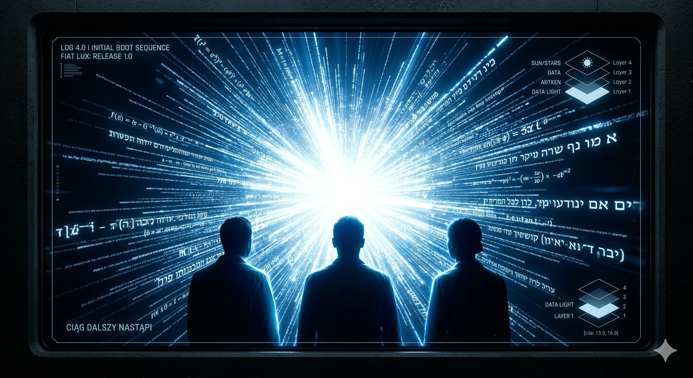 Piotr: (zaciera ręce, palec zawisł nad klawiszem ENTER) Dobra, panowie. Mamy gotowy hardware, mamy pole nośne (Ducha), mamy ciemność, czyli pusty kanał transmisyjny. Biblia mówi: „I rzekł Bóg: Niech stanie się światłość!”. Powszechnie myśli się o wielkim rozbłysku, o zapaleniu gigantycznej żarówki w pustce. Ale ja tu widzę Initial Boot Sequence. To nie jest opis optyczny, to opis pełnej synchronizacji systemu.